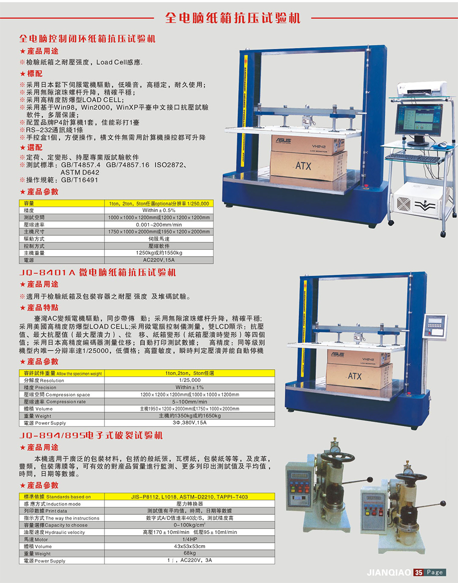 產品型號:JQ-8401 品牌:劍 喬 用途:全智能電腦控制紙箱耐壓測試儀/整箱抗壓試驗機/空箱抗壓強度測試儀是一款多功能標準型紙箱質量檢驗設備,主要用于各類中等常規尺寸瓦楞紙箱的抗壓強度試驗或其他材料制成的抗壓強度小